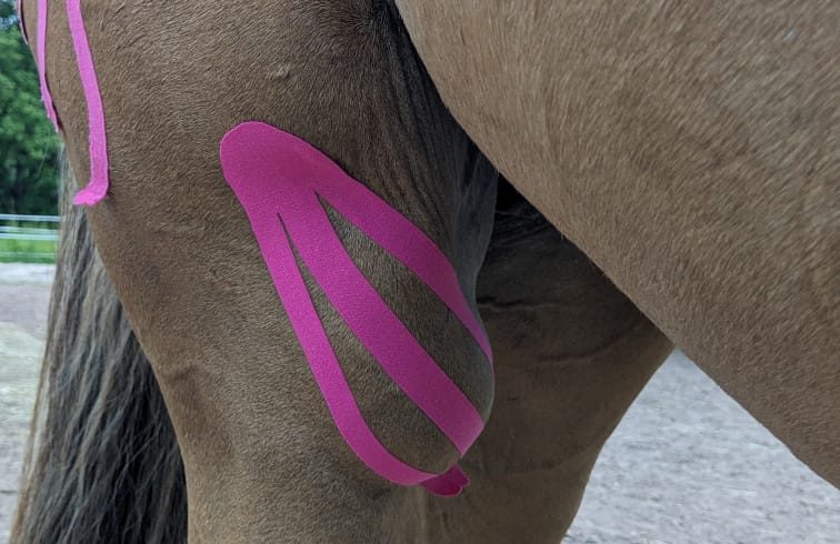 Sanfte, dehnbare Tapeanlagen, die den Lymphfluss fördern, Schwellungen reduzieren und die Heilung nach Verletzungen oder Operationen unterstützen (wie hier auf dem Foto nach einer Trittverletzung am Knie einer Stute). Sie entlasten Muskeln und Gelenke und sind vollkommen schmerzfrei. Besonders sinnvoll bei Schwellungen, Muskel- oder Gelenkproblemen und nach Operationen.